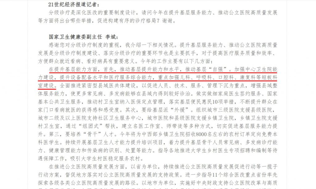 在會上,國家衛(wèi)生健康委副主任李斌分享了有關落實分級診療制度相關工作的主要幾方面。他指出在提升基層能力方面,首先,推動基層提升能力和水平,推動基層“自強”。加強中心衛(wèi)生院能力建設,提升設備配備水平和醫(yī)療服務綜合能力,重點加強兒科、呼吸科、口腔科、康復科等短板科室建設。